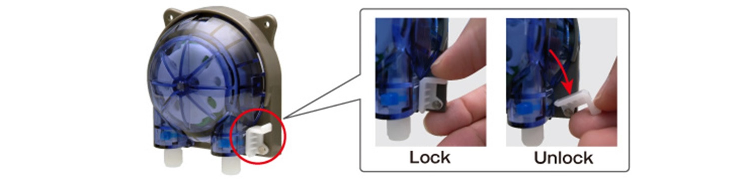 We have added parts, to avoid falling away of the cassette from the pump body, when operating the pump to both directions is required. You can unlock/lock the cassette at your finger tips. Optionallly available.